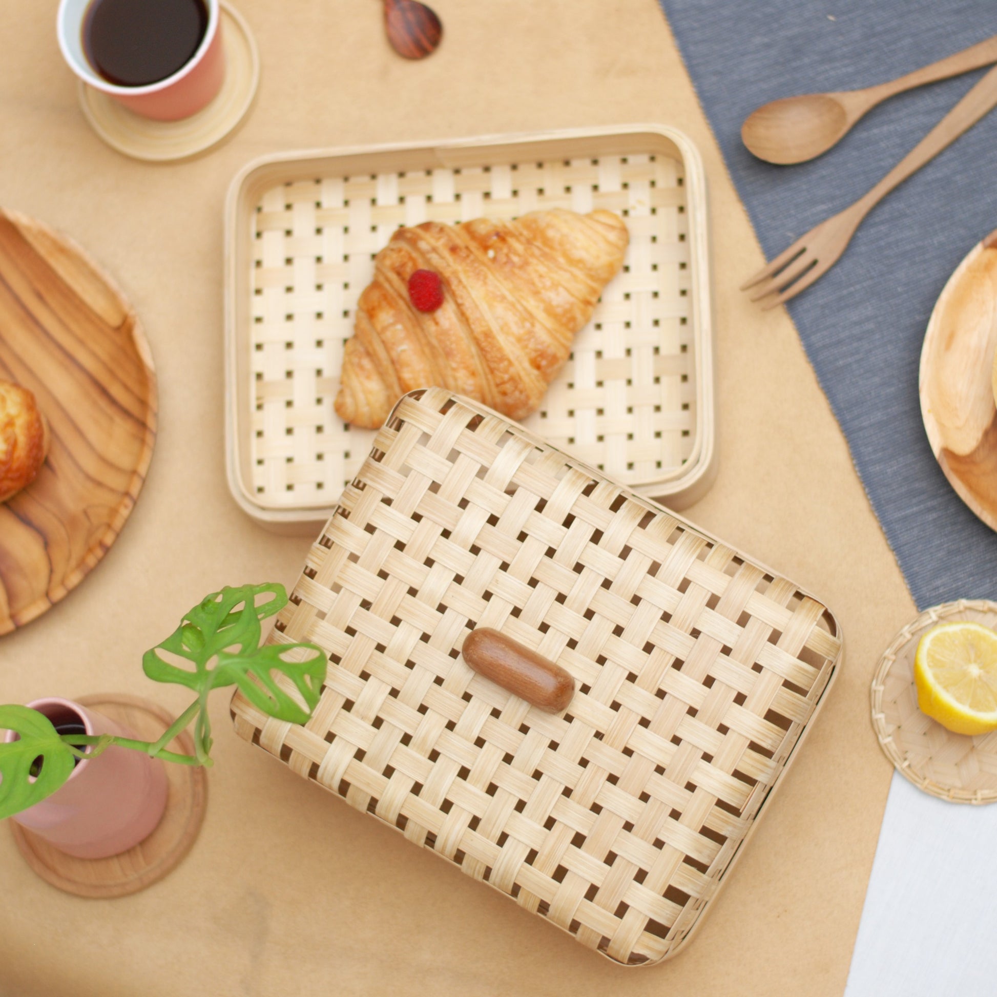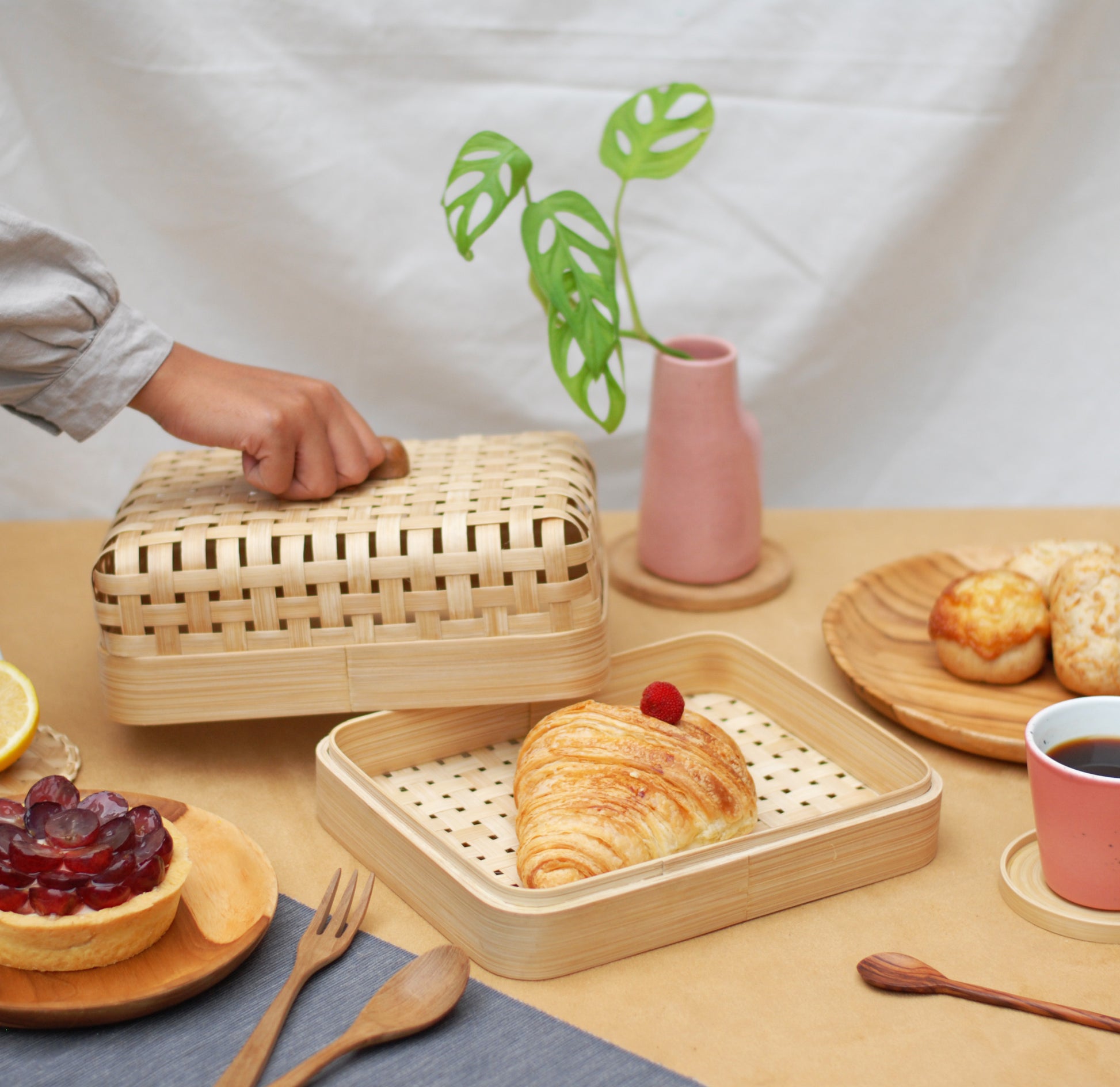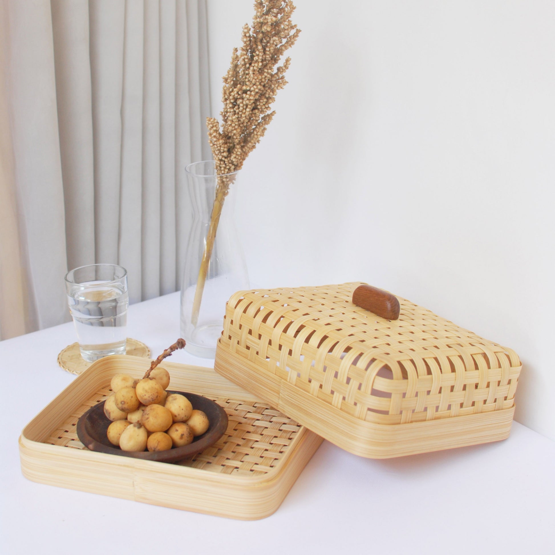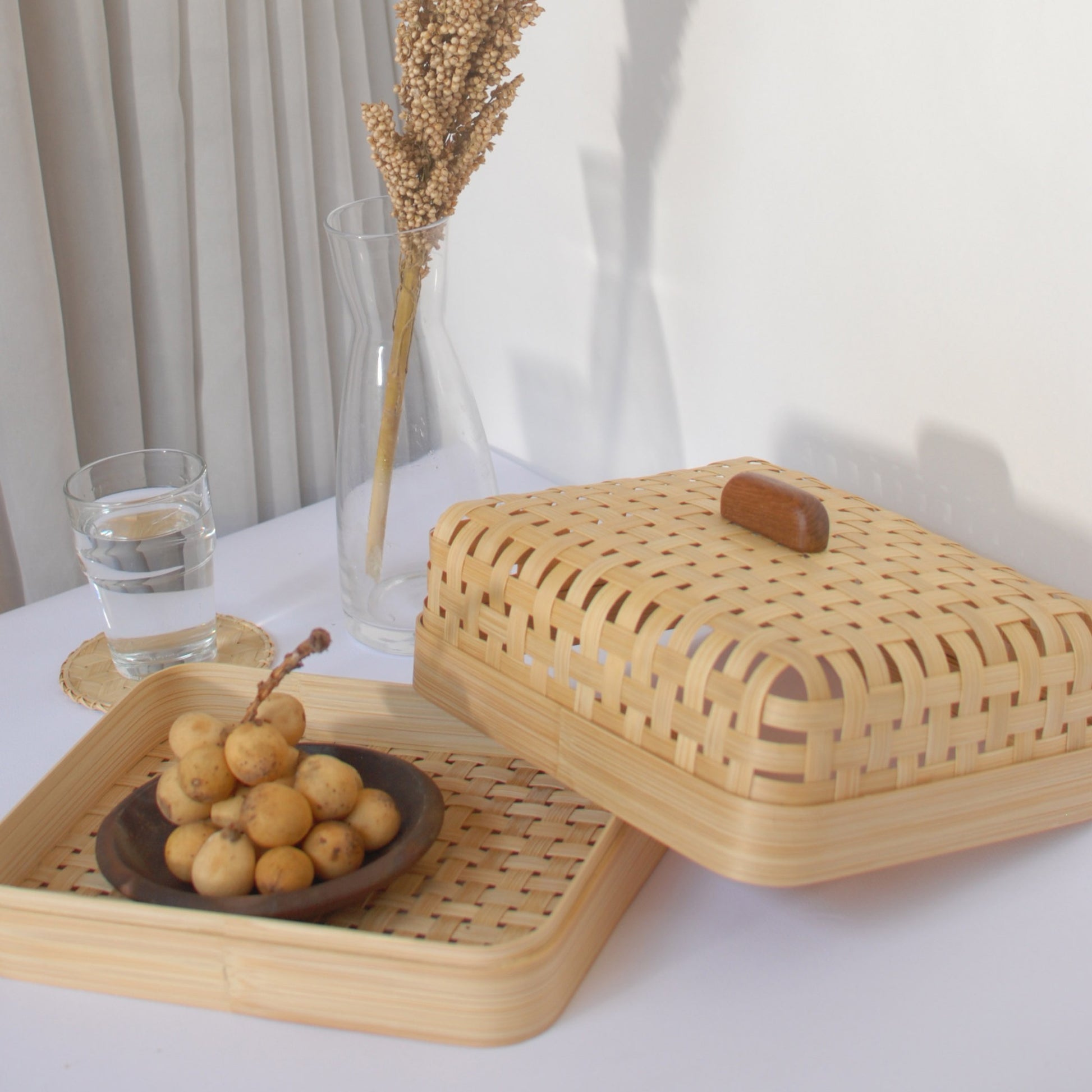 PRODUCT OVERVIEW The Oupat is a rectangular food cover and tray set that combines practicality with elegant design. Its handcrafted bamboo construction ensures durability, while the woven pattern reflects Indonesia's rich cultural heritage. Ideal for serving a variety of snacks or protecting food during gatherings, the Oupat is both functional and visually appealing.