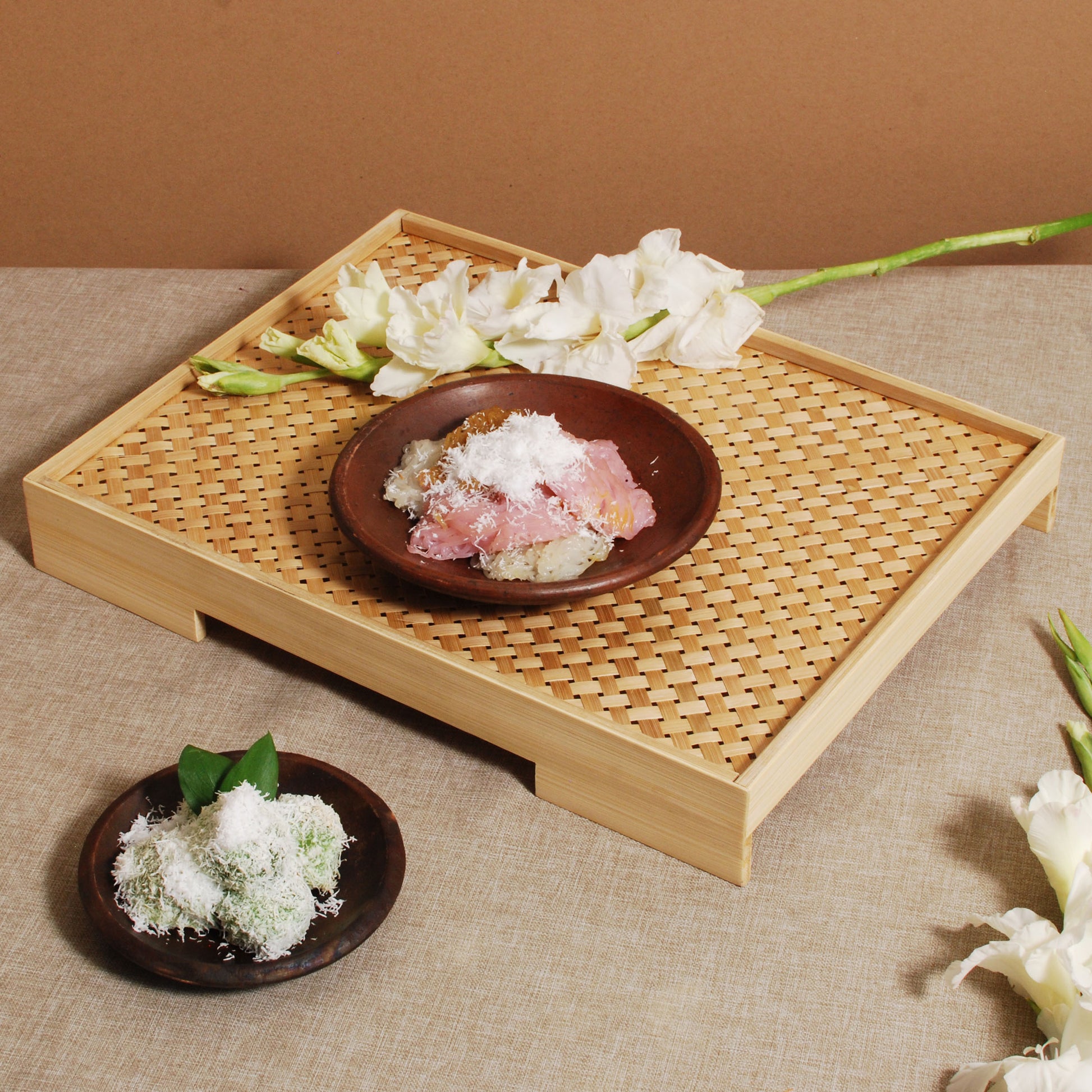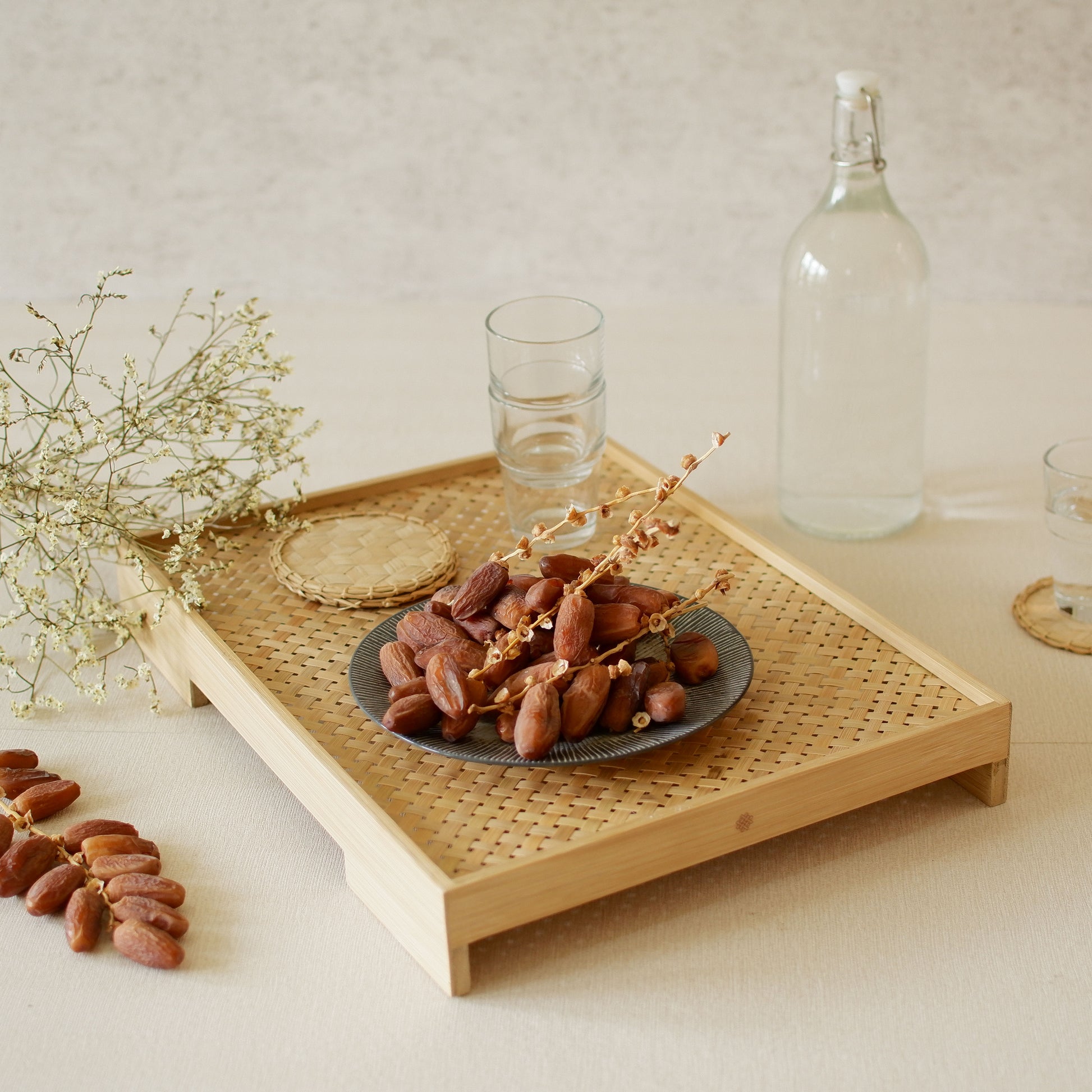 A basic rectangular tray for general serving purposes. Its weaving is made of bamboo skin which is stronger and more durable