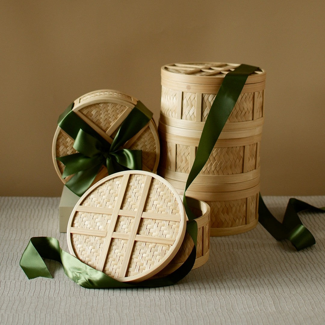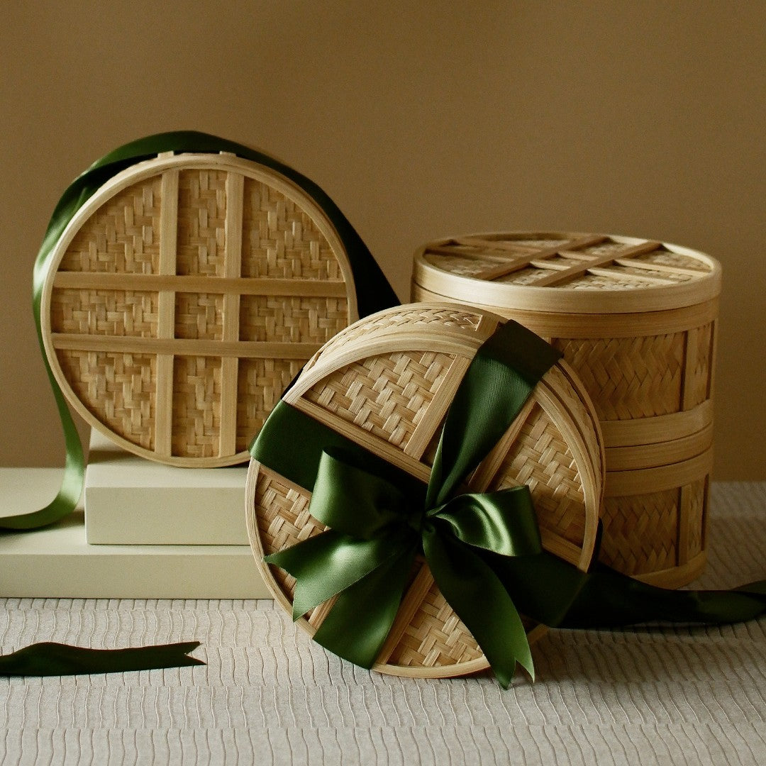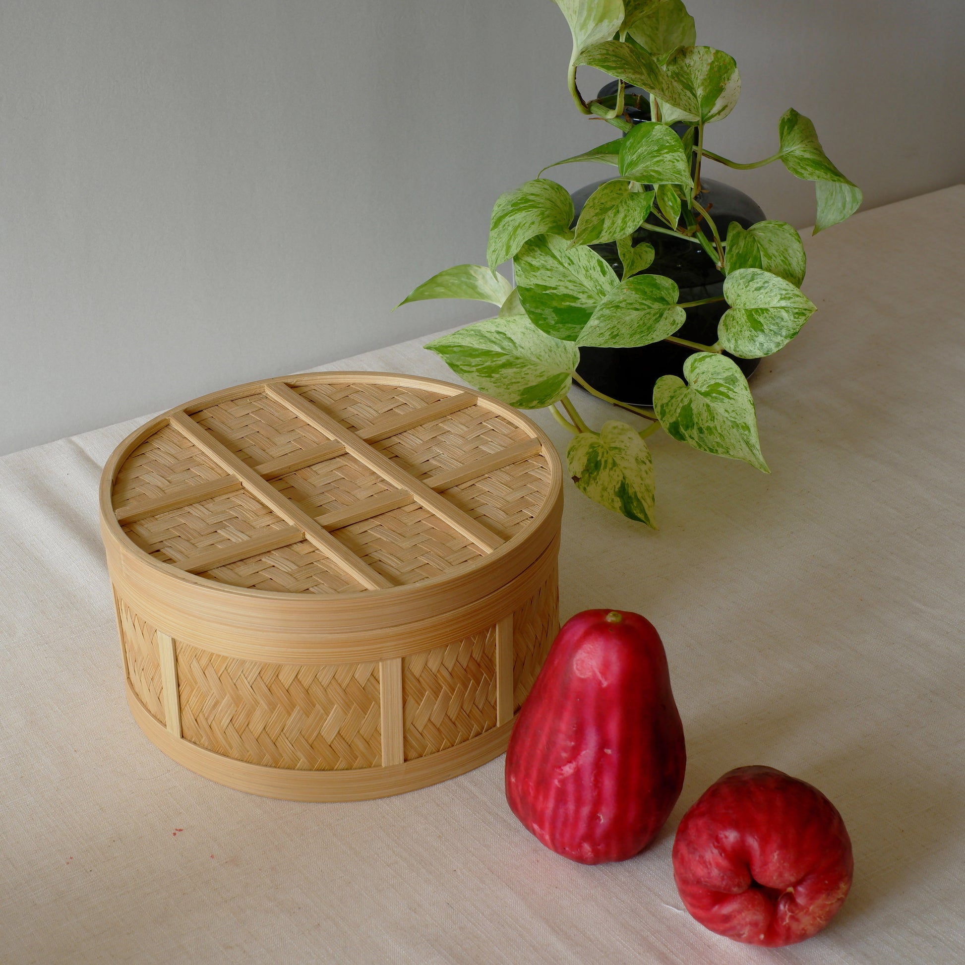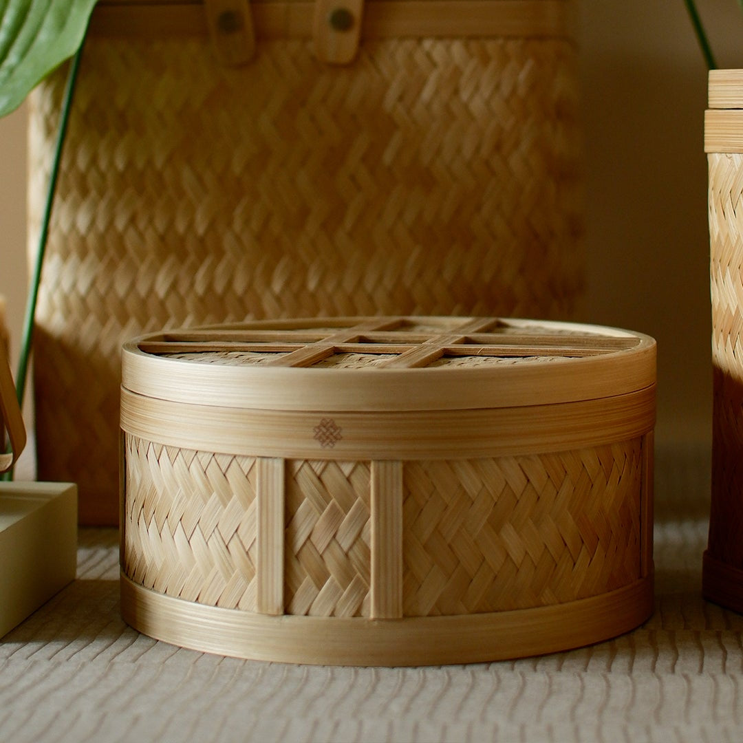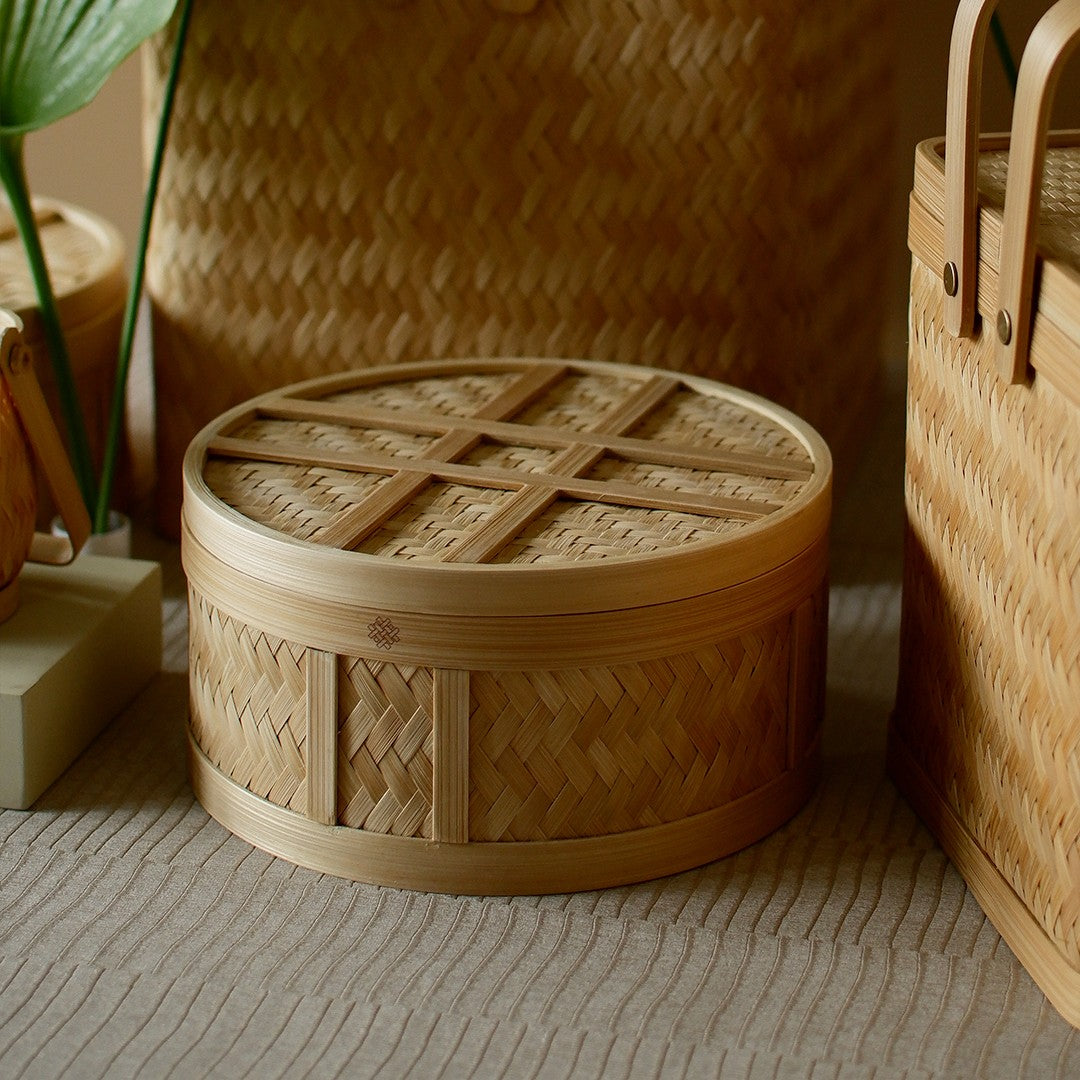 PRODUCT OVERVIEW The Round Hampers are a charming and versatile storage option, beautifully handcrafted to showcase traditional Indonesian bamboo weaving. Designed with gifting and small-item storage in mind, these hampers are perfect for organizing knick-knacks, jewelry, or other small treasures. Their compact size and natural finish make them an elegant addition to any room or a thoughtful gift.