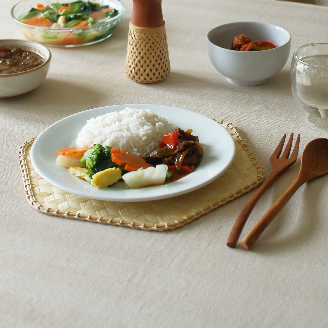 PRODUCT OVERVIEW The Satwastu Placemat blends traditional craftsmanship with modern aesthetics. Designed to elevate your dining table, it showcases intricate bamboo weaving that reflects Indonesia's rich cultural heritage. Available in small and large sizes, this placemat is perfect for various table settings, bringing warmth and elegance to your home.